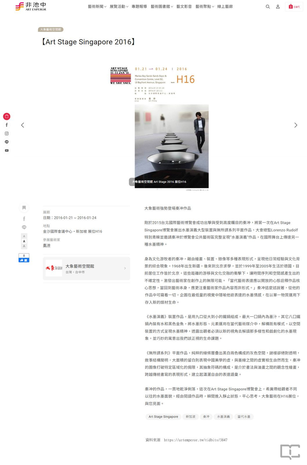 描述:2016年01月21日至2016年01月24日,大象藝術空間館參加Art Stage Singaporte Pte Ltd.、新加坡國家藝術理事會(National Arts Council, Singapore)、新加坡旅遊局(Singapore Tourism Board)、經濟發展局(Economic Development Board)舉辦「ART STAGE SINGAPORE 2016 」。