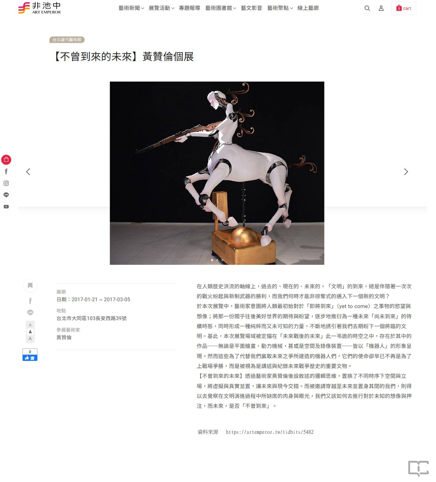 描述:2017年01月21日至2017年03月05日,大象藝術空間館參加臺北當代藝術館舉辦「不曾到來的未來:黃贊倫個展」。