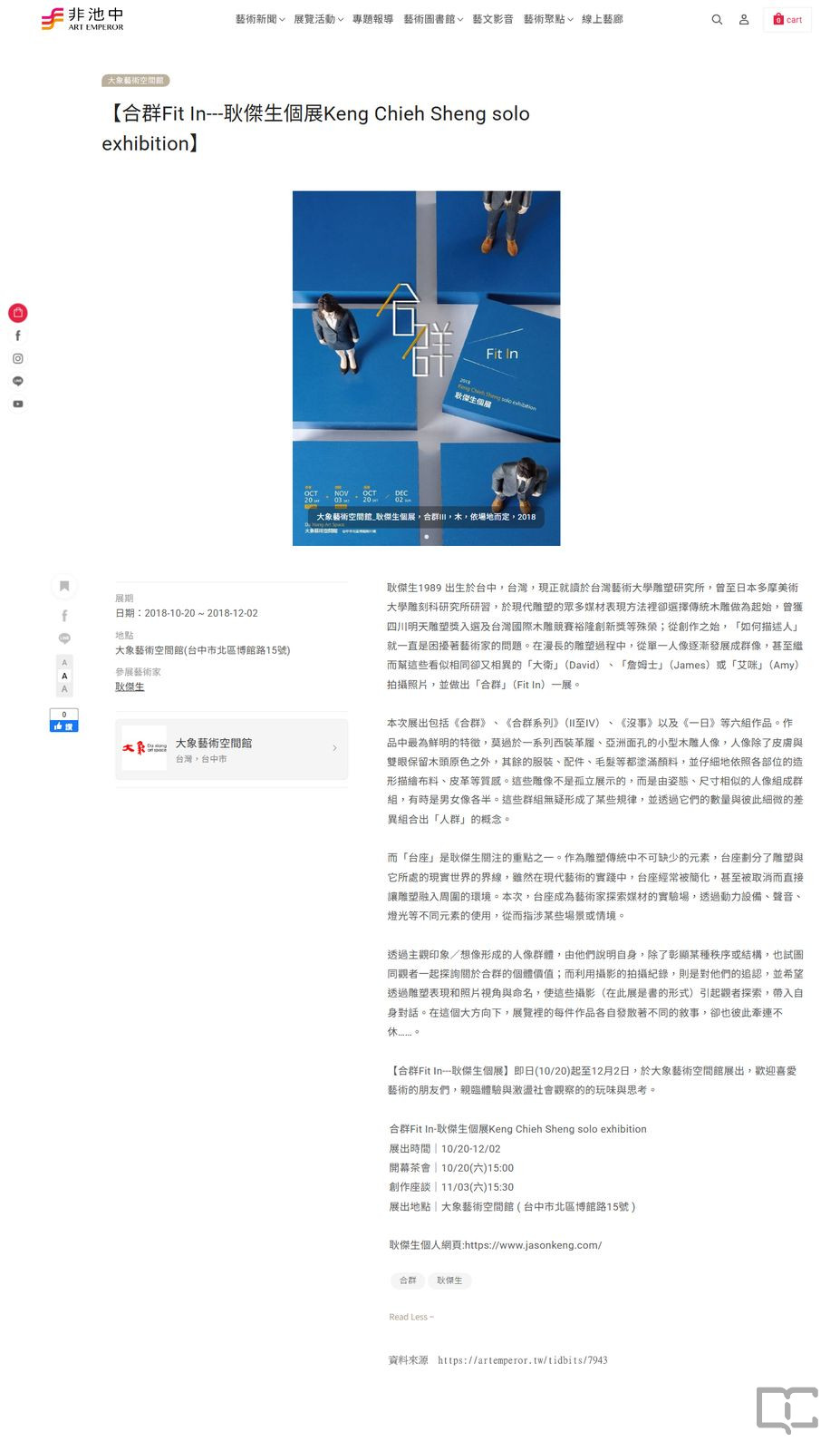 描述:2018年10月20日至2018年12月02日,大象藝術空間館舉辦「合群Fit In:耿傑生個展」。