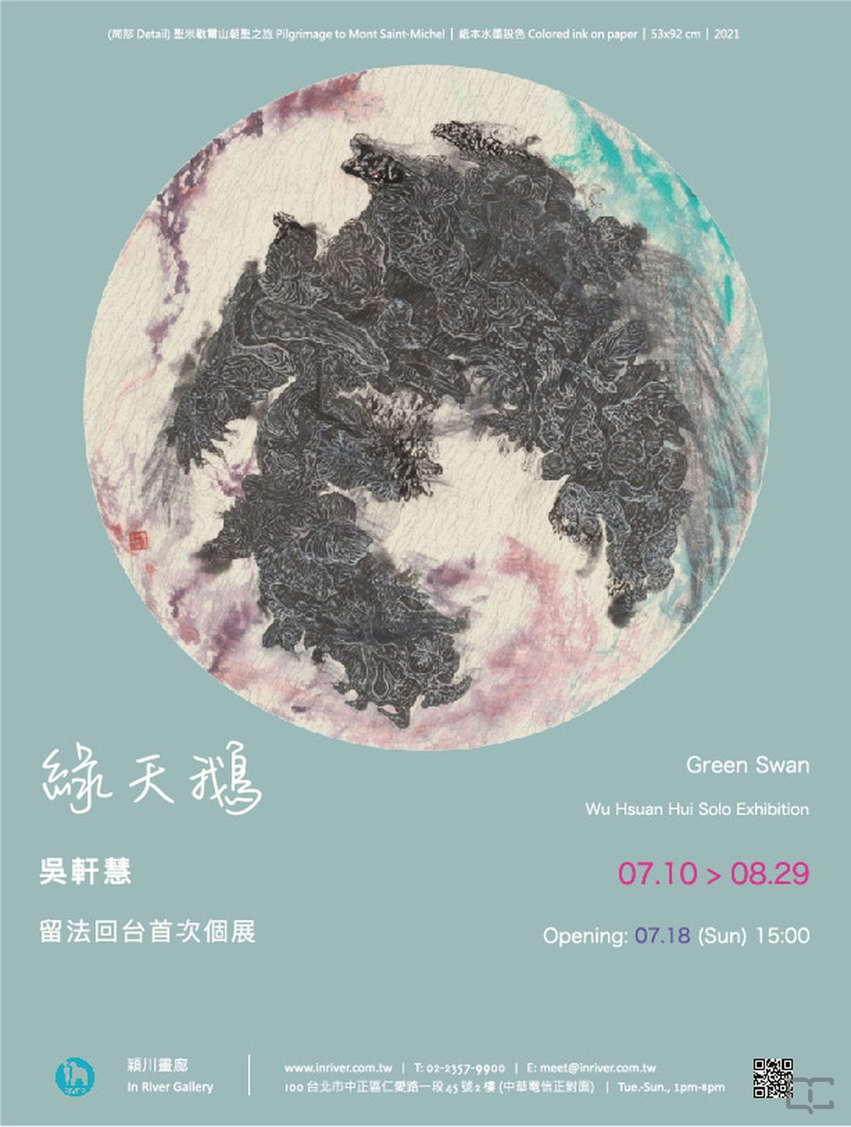 描述:2021年07月10日至2021年08月29日,穎川畫廊舉辦「綠天鵝 ── 吳軒慧個展」。