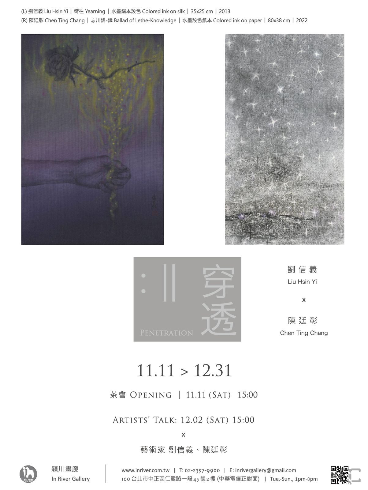 描述:2023年11月11日至2023年12月31日,穎川畫廊舉辦「: ∥ 穿透──劉信義、陳廷彰聯展」。